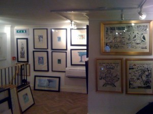 One of the highlights on our calendar is the Winter Exhibition at the Illustration Cupboard in Bury Street, London. This little gem of a gallery houses originals and limited edition prints of mostly children’s illustrators. This year the display includes animation cells from The Snow man and layouts from Judge Dredd as well as the highly detailed watercolours of Inga Moore for The Secret Garden and Wind in the Willows. Also on display were John Vernon Lord, John Lawrence and Jane Ray amongst many, many others.