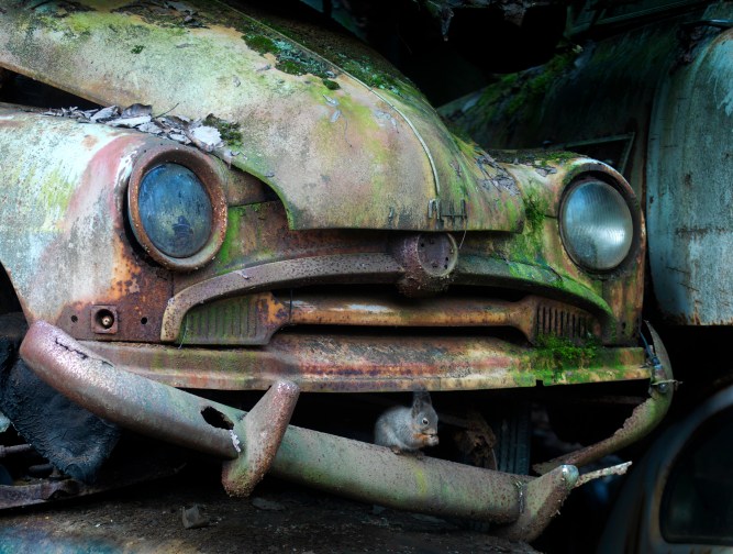 Above: Bumper Life by Pal Hermansen (Norway) shows an abandoned scrapyard in Sweden that for the last 60n years has been home to the wildlife that has claimed the wreckage. Nuts were used to tempt this squirrel to pause for the photo opportunity amidst his daily exploration of the yard. Veolia Environnement Wildlife Photographer of the Year 2012.