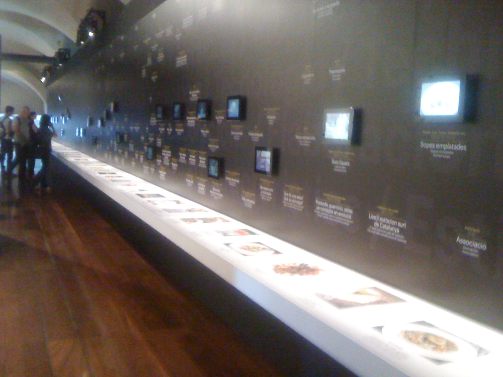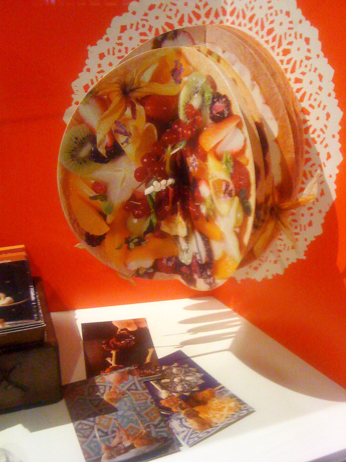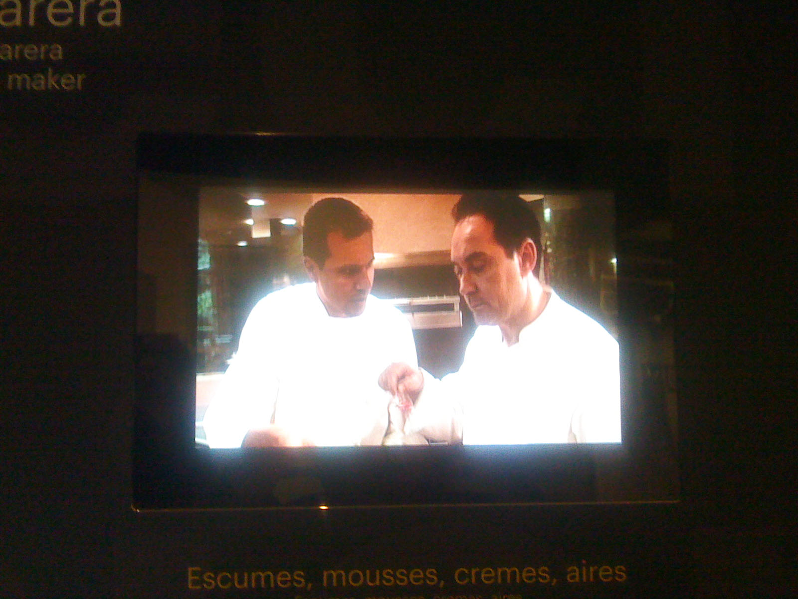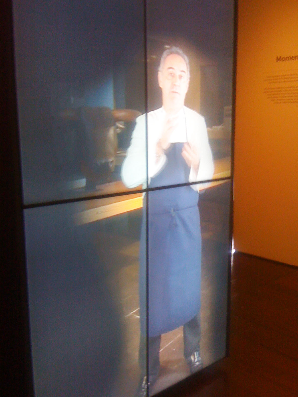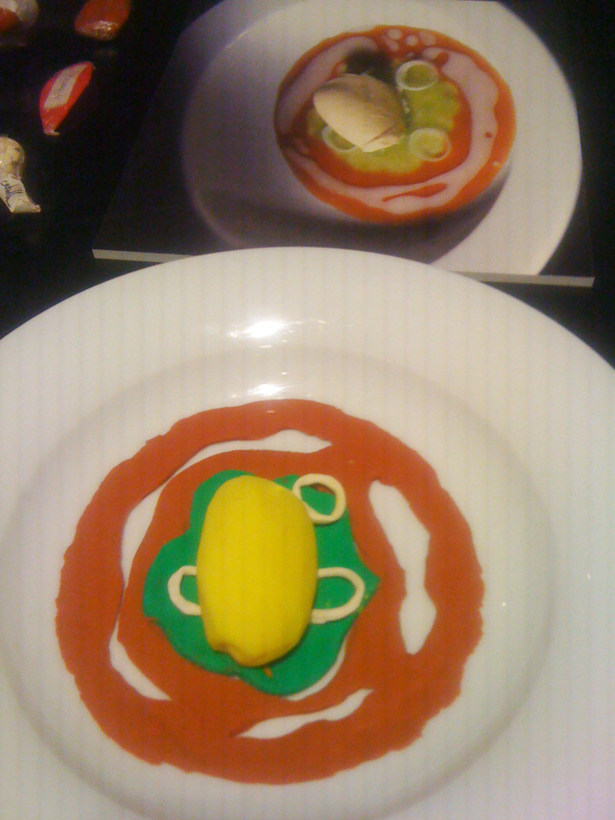 …vigorously waltzes you through the bursting colours; grates and oozes you face first over the textures; shocks you with the food photography (personally I wouldn’t like to eat a baby octopus pirouetting on its tentacles – but the stunning black and pink of the photo is mesmerising); tempts you with the over-sized chocolates; plonks you at the projected elBulli table and serves you virtually while the other customers eat, drink and are merry behind you on screen; captivates you into conversation with the gesturing chef on a life-sized screen; stings you with interest at the range of notebooks and journals (why is there a lovely illustration of a dead bird?…I suppose it is an ingredient, or perhaps just its tongue is); dazzles you with the shiny range of cutlery that some OCD magpie has lined up in a glass case; wafts you over, under and around bits of moulded and bent metal that are something mysterious and spell-binding to do with shaping pieces of food; recalls childhood memories of the tackily designed covers of well-thumbed 1960s and 70s European and Moroccan recipe books; shrinks you to guide you through bleached bone coloured 3D models of the buildings on their rocky shore-line; flings you into the ball-pit of coloured plasticine shapes that are prototypes for plated recipes (I loved this section of plate mock-ups next to projected finished pieces – real hands-on design emphasising the aesthetics of the food not just the taste); insists to you that the chefs are rock stars by displaying their Stones albums as well as their photos; educates you by blending science and cookery…..I hope this reads more like a poem than a list because the experience made me feel poetic!