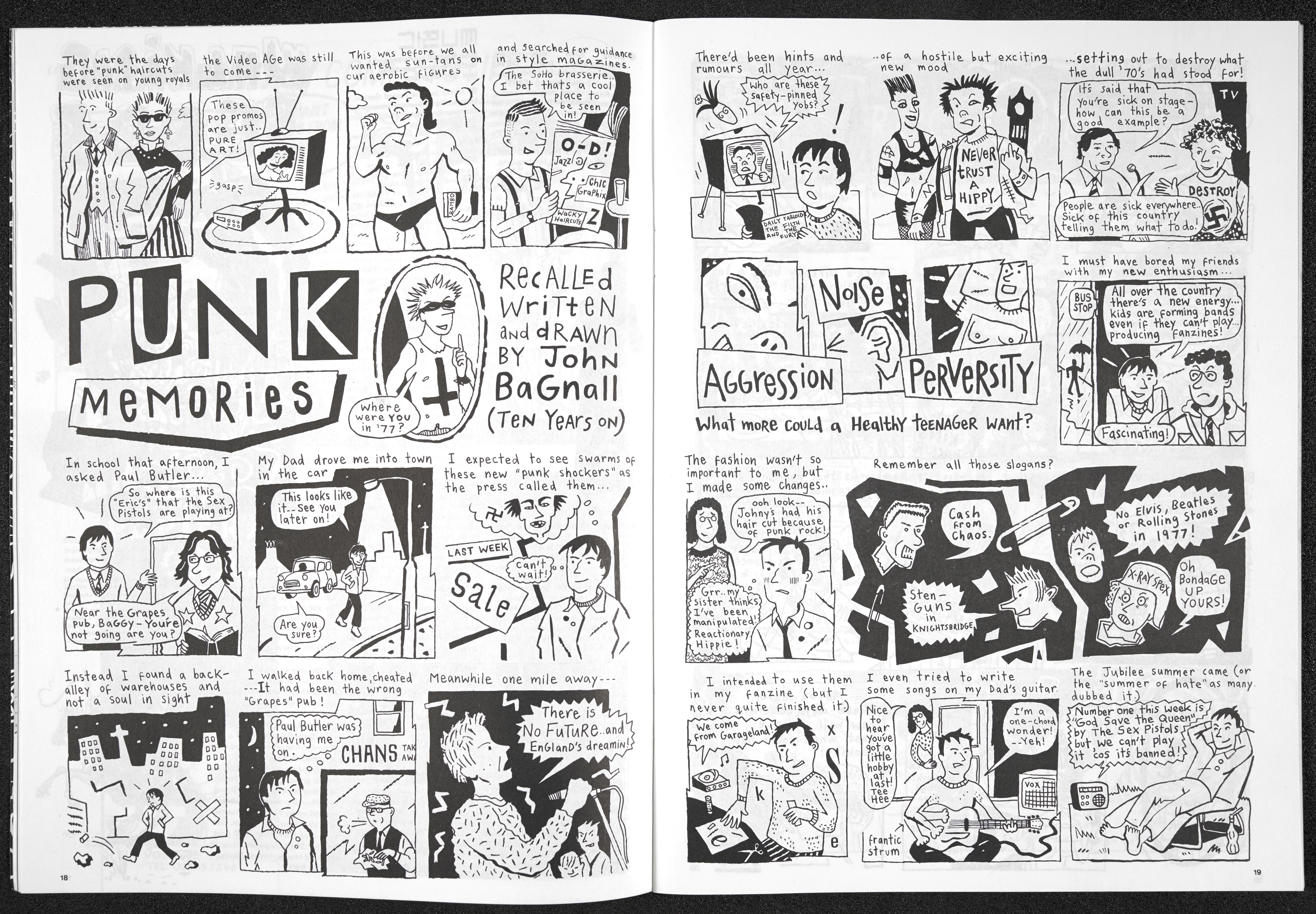 And, yes, when I found a comic – Punk Memories (above) – that appealed very directly about a story that I shared with the maker, John Bagnall, I did engage in a very intense, amused and intrigued manner. I was sorry when I got to the end of the double page spread and could not turn over the page behind glass. Bagnall makes his autobiography of punk times tongue in cheek, with his sister commenting on his nice new haircut and his mum liking his “hobby” of three-chord wonder-ing on his guitar. Maybe I just cannot get into tales of adventure with sharks and superheroes! May be I just like my satire too realistic!