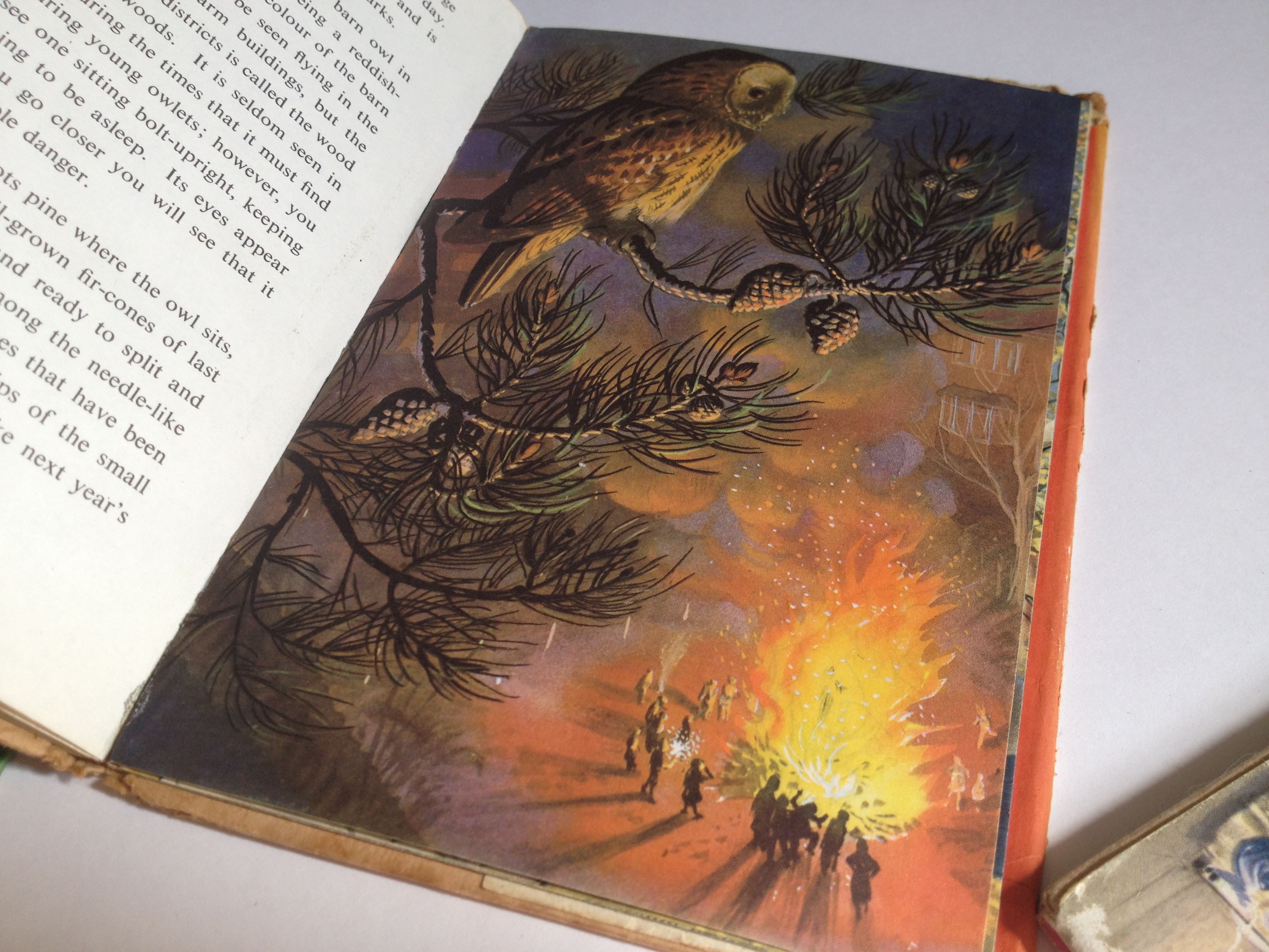 What a thrill I had the first time I saw that tawny owl high up in a tree “astonished” by the bonfire night glow below it. There I was, and there I am every time I see this image, up in the tree with the owl – so far removed from the earth-bound creature I really am in a little moment of fantastic nature observing humans. Seeing this image I began to notice composition and how it can be part of a narrative. To see the world of people from the owl’s point of view, or rather to share it, was such a magnificent privilege. I didn’t know then that the illustrator of this series was Charles Tunnicliffe. I just knew that I could get inside his pictures and be there in that September of berry eating birds or feel the squelch of mud on the farmer’s boots. I also knew that the dwelling that he illustrated in The Farm, complete with kittens, of course, was the place I would live as an adult. (It is not!)