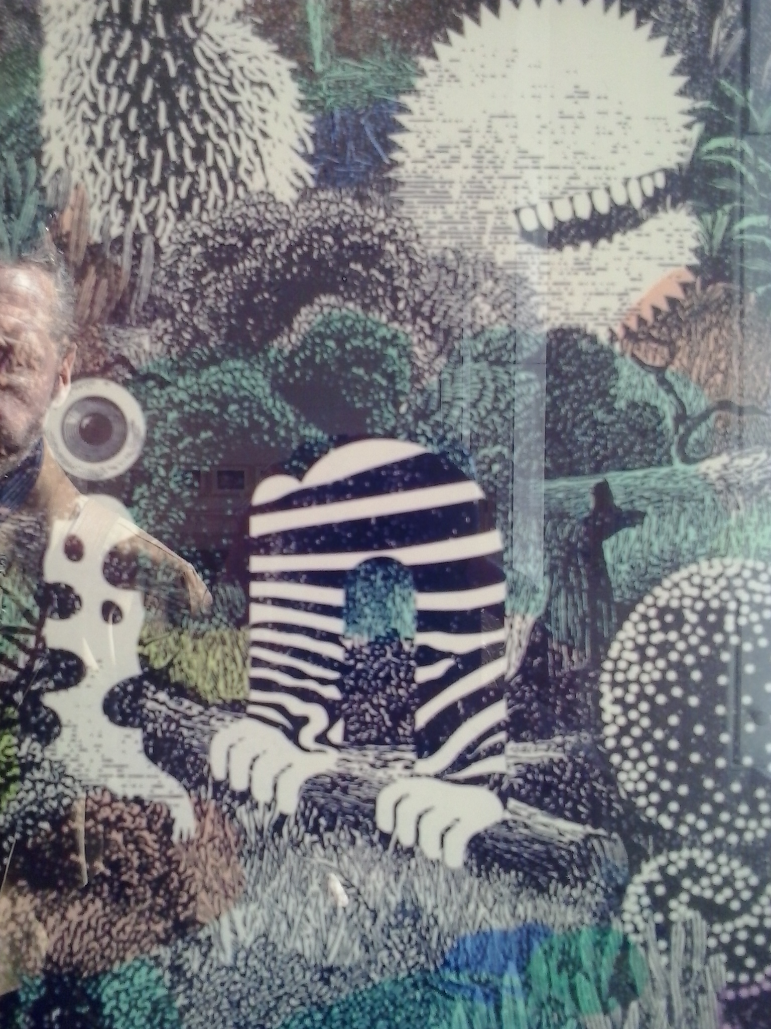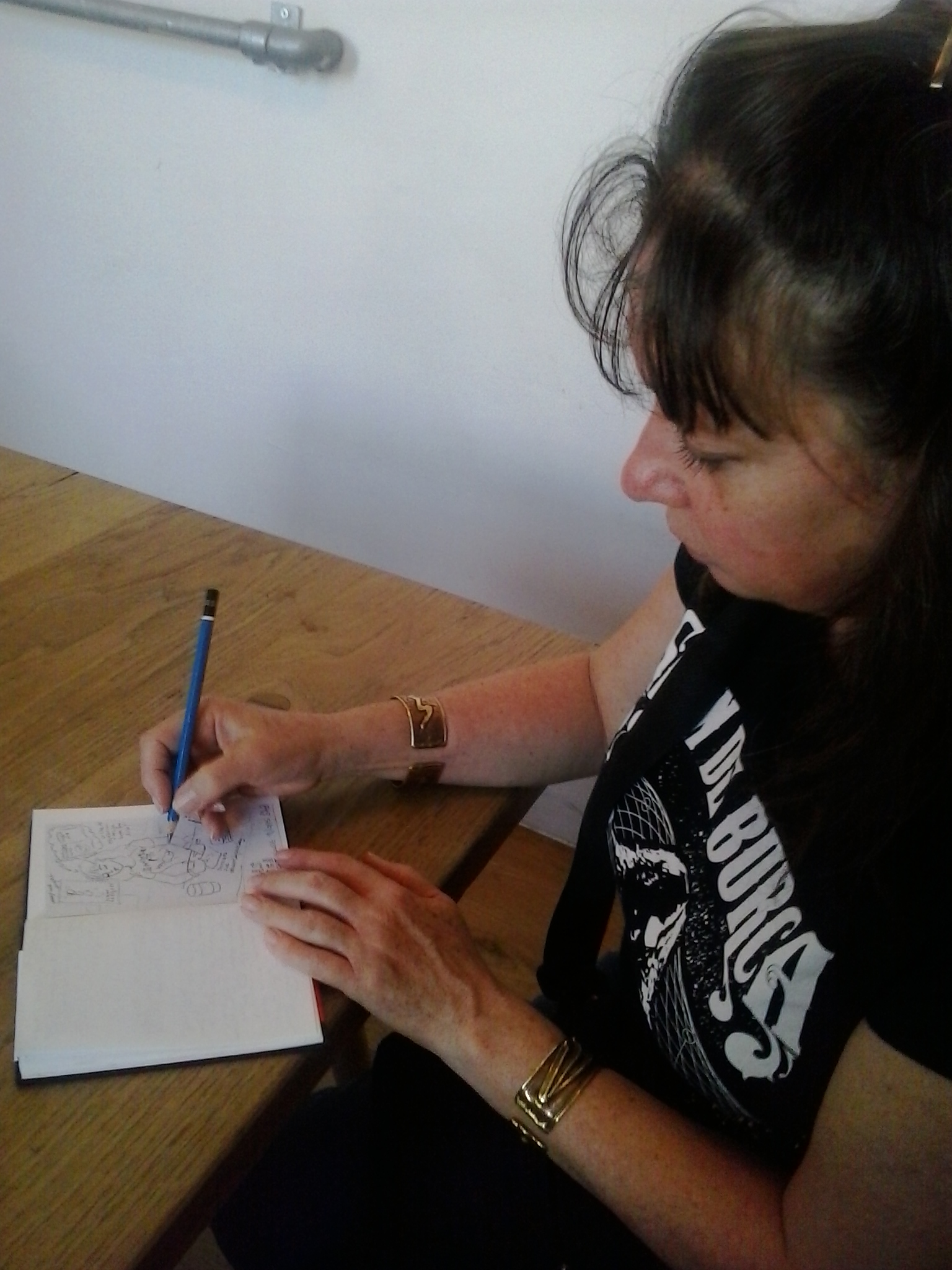 So in making my five-minute postcard I tried to make a link to the style of Kugler, both by working my little illustration in pencil first and highlighting some parts in fine liner pen. And also by borrowing Kugler’s speech balloon motif to create a thought bubble for my subject – me making my postcard and being inspired by the day’s events and sights. My thought bubble showed a vegetarian recipe book that I picked up the cafe and I am shown wondering if it is for sale as it has a price in it. (Aubergine loaf, appearing soon at a dinner near me!). I included a reference to the Syrian refugees works and to my ever-present notebook which is brimful of a project the Graphic Design Project is preparing about interactive calendars for kids. I showed my T-shirt which advertises Sean de Burca’s Mechanism C.D. as I was actually wearing this but also because I wanted to emphasise in each element in the small image that I am surrounded by creative people – family, colleagues, exhibitors and, of course, students – and that thinking about inspiration and ideas is what keeps me happy! I don’t mind if the ideas are about dinner or education or design projects. I would have included the armful of publications about artists’ books and nature that I picked up in the book sale if that did not happen after the card was done…but you can see me clutching this bundle of inspiring books as I post some of the cards and Tim also has a batch of book inspiration too.