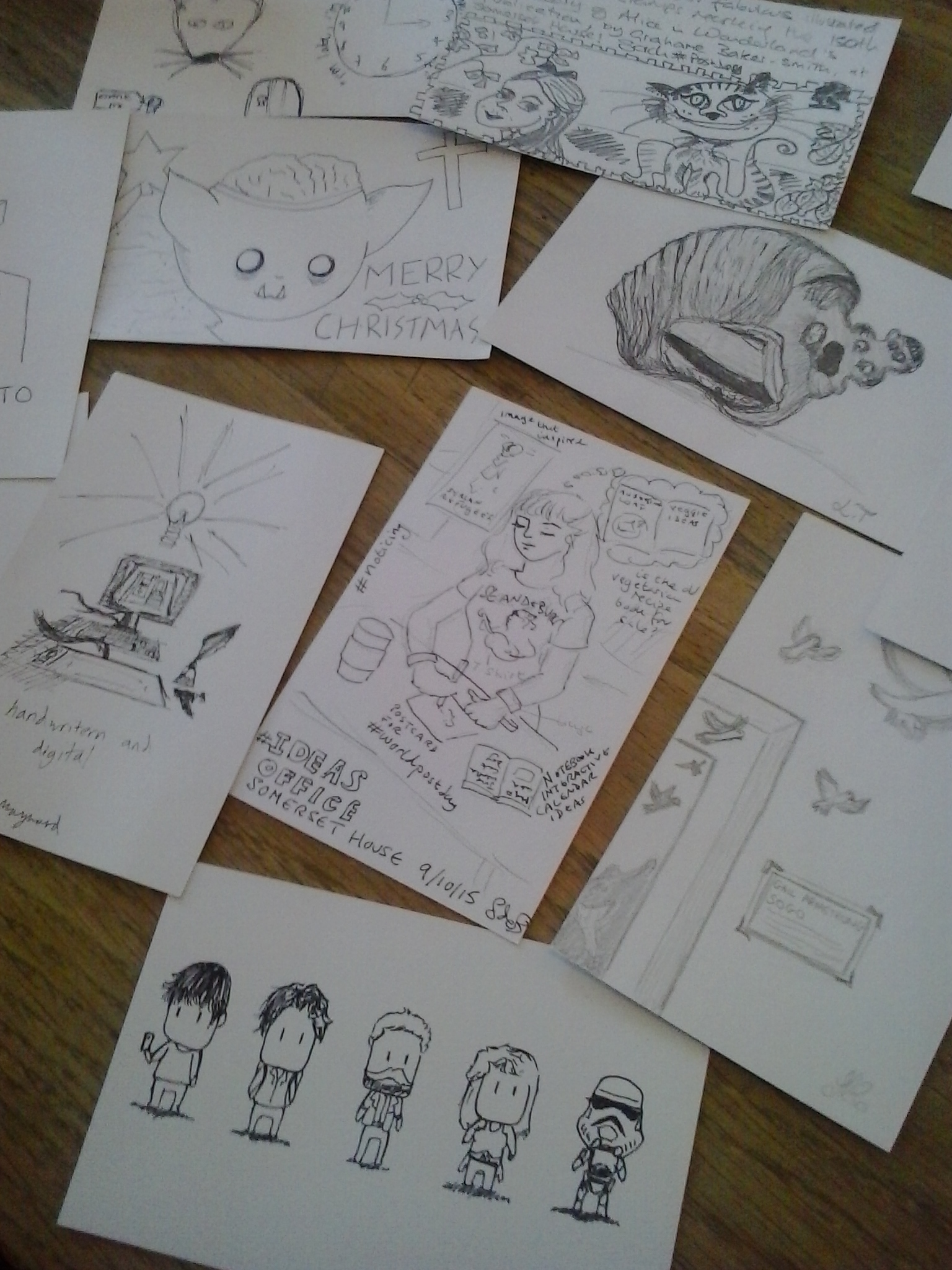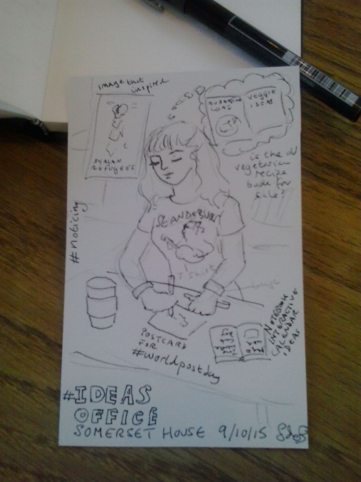 Yesterday, October 9th, was World Post Day and Curious Events Day – a combination not to be missed. So on a trip to London’s Somerset House, my colleague, Tim Bones, and I asked our University of Kent Graphic Design students to not only review the fantastic World Illustration Awards, but to make a personal response on a postcard. From the point of view of creativity, especially for students starting new courses, this is a really useful exercise as it is all too easy to forget what you see and think, and so by sketching, making notes or making any other personal response on the postcard the things seen and noted can be more readily fixed into the long term memory. Here they’ll be ready to be recalled by connecting neurons later to make brand new ideas. “Throw away” activities also help to overcome the very real fear of failure or of performing “badly”. Anyway, even without the worthiness, making a postcard is just fun!