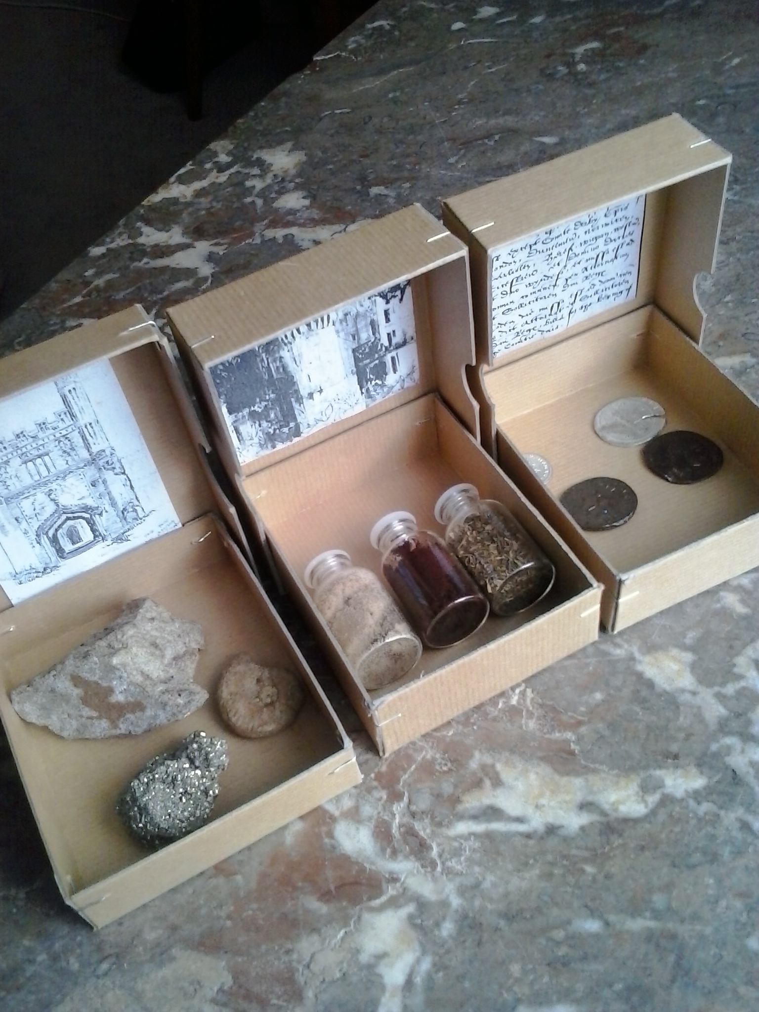 The idea of presenting a group of objects and letting the viewers/users/participants make their own stories from them is right up my street. I have, for instance, always admired and referred to From the Freud Museum by Susan Hiller. I’ve lost count of the times I have used this in my teaching to demonstrate audience agency, semiotics, ideology and indeed phenomenology. But mostly, I just love it because I connect with it. In this artwork Hiller sets out a collection of objects in museum style cardboard boxes, set in rows and displayed in a large vitrine or glass cabinet, mimicking a serious museum exhibit. Each box contains an object or set of objects, such as vinyl or Bakelite records, a ouija board or glass vials of sand. The upright box lid displays a printed piece of ephemera. And then each set of contents, with their printed piece, is given a name label. The key to the audience interaction is that the three things – contents, printed piece and label – are often randomly put together. They don’t necessarily have a real link. I use the word “random” loosely here, because as much as Hiller wants to make the audience build their own inner stories from her selections, select them she has; and even/especially the artist’s mind makes its own judgement of what is appropriate for an artwork.