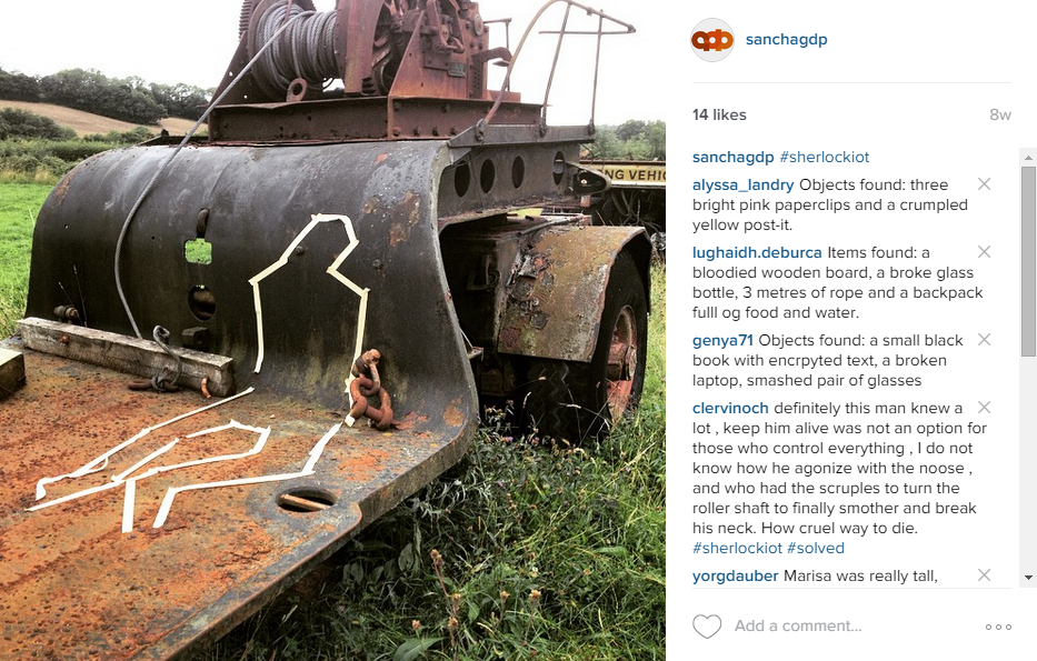We started our explorations with a game in which we marked out with tape or chalk a body from an imaginary crime scene. The more odd or picturesque the scene we made the better this worked. Then photos were put on Instagram (#sherlockiot) because it is the perfect platform to view a photo and add to its story via the comments. Then another person added in a description of an object or two that were supposedly found at the scene. Then a third player amalgamated the photographed crime scene and the objects to make the connections into a narrative. Each player does all three activities, making online connections with other players.